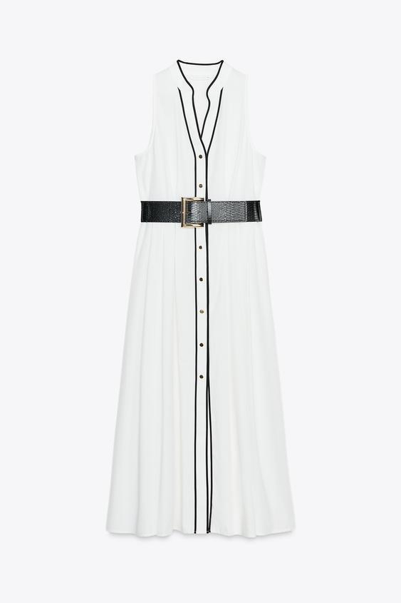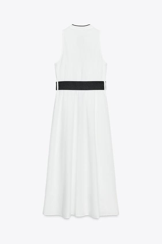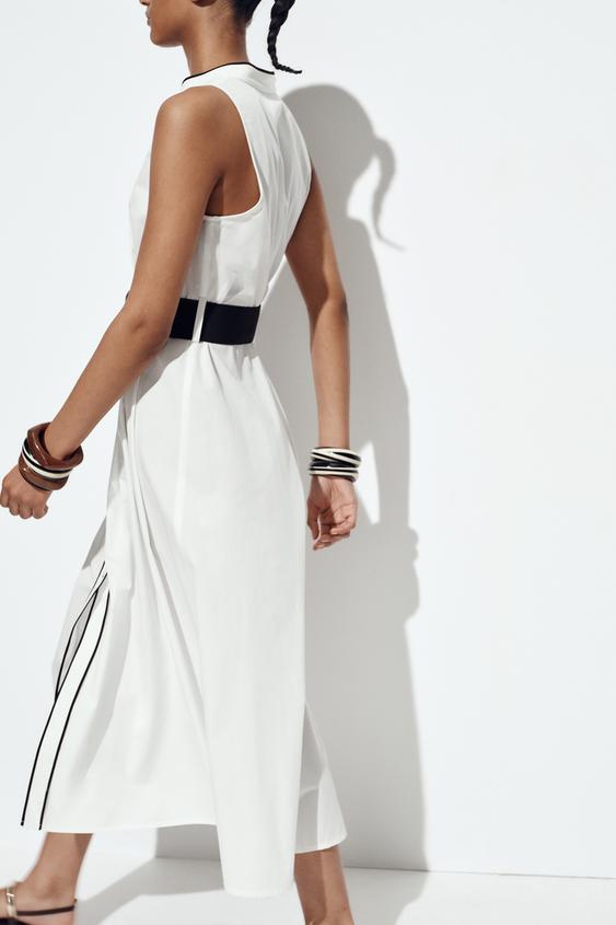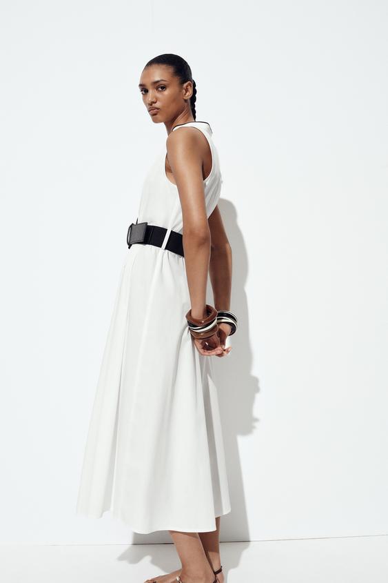 Cette robe midi en popeline offre une élégance sobre et raffinée, sublimée par ses finitions contrastées. Sa coupe structurée met en valeur la silhouette tout en garantissant un confort optimal grâce à son tissu léger.